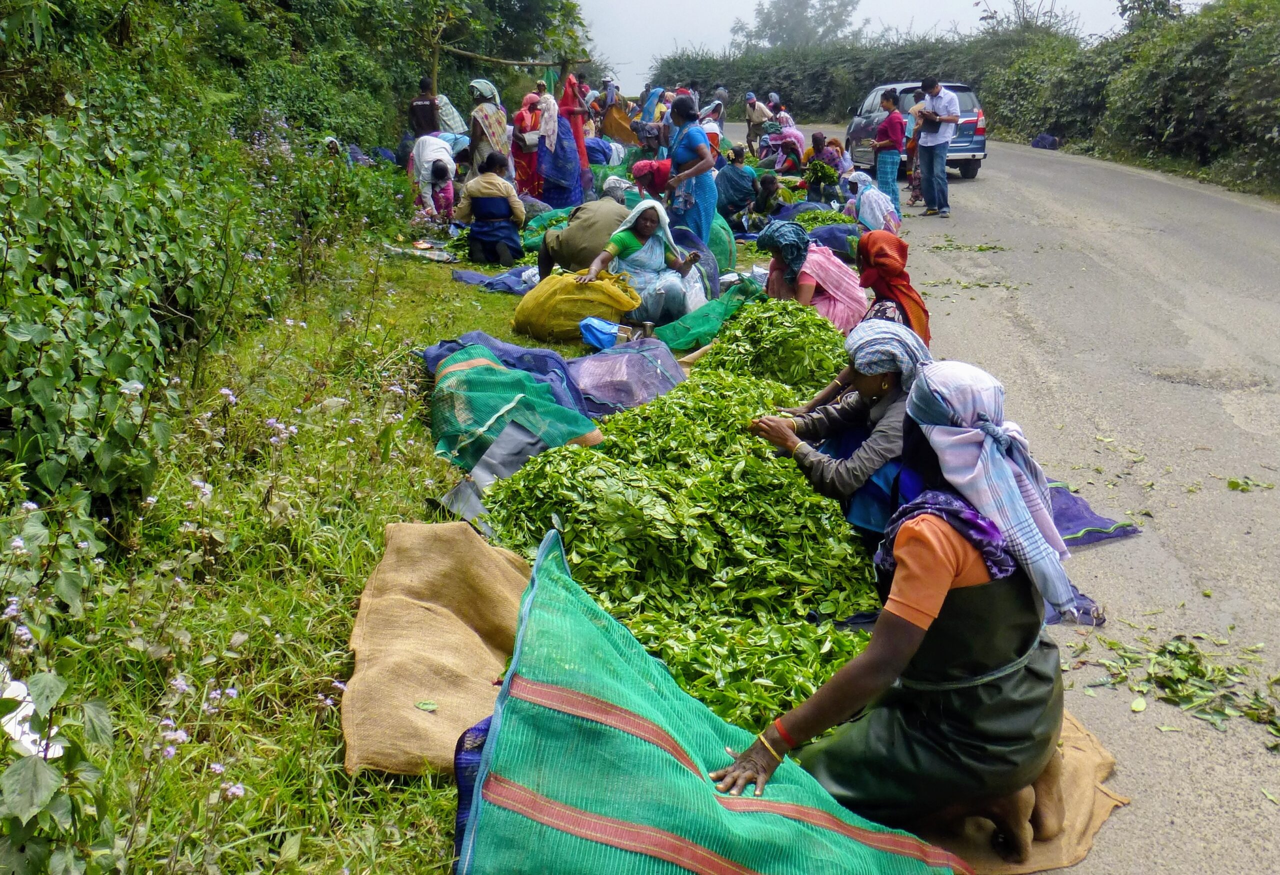 On the way back I suddenly spotted a colourful mass at the side of the road. Large, bright sacks filled with tea leaves, piled up along the tarmac. Next to them sat a group of women and the occasional man, quietly waiting. These were the pickers, ready to have their harvest weighed. Along the road, poles with hooks marked the weighing spots.